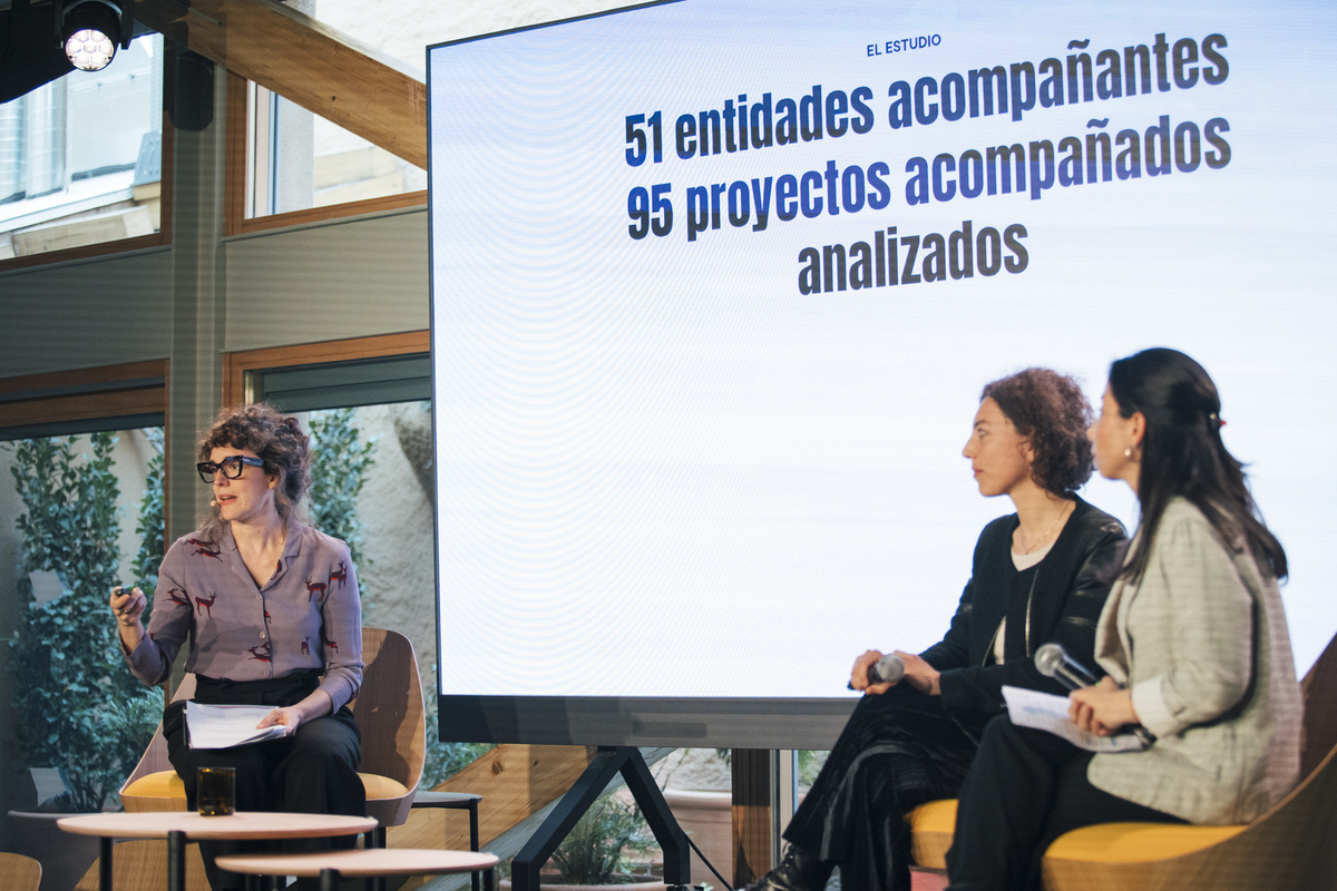 In the first table, Deborah Gold, impact investment advisor at the Daniel and Nina Carasso Foundation in Spain, spoke with the independent researcher Andrea Macías, in a conversation moderated by María Lorenzo, coordinator of the Gabeiras Foundation. In their speech, they highlighted the need for the sector to consolidate structures in order to think in the long term. To this end, being able to secure sources of financing is one of the keys, as can be seen from the conclusions of the report, which also shows the impact of these accompaniments on the economic sustainability of the projects. The instability of financial support – which in almost all cases is allocated to specific projects, not to structures or specialized services such as bankable expenses – makes the long-term path difficult.