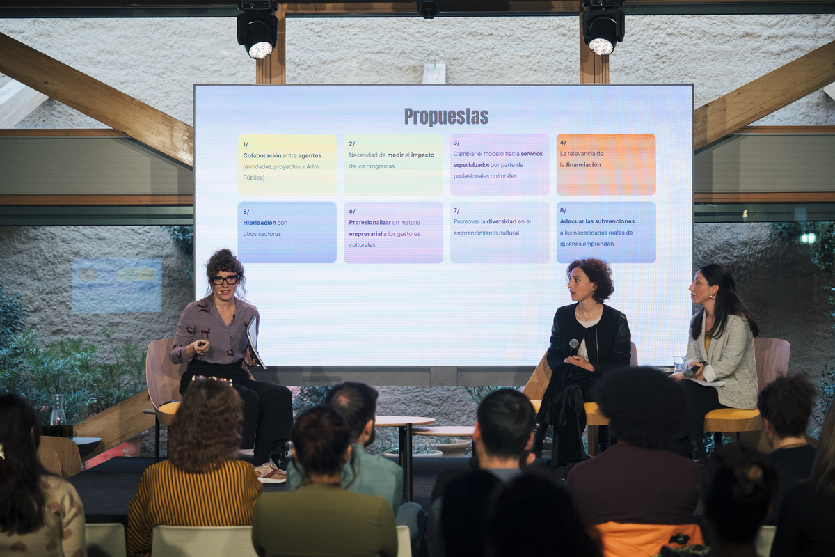 The session, inaugurated by María Suárez, InPulse’s curator of entrepreneurship, was attended by Lucía Casani, director for Spain of the Daniel and Nina Carasso Foundation, as well as Patricia Gabeiras, founding patron of the Gabeiras Foundation. From there, the day was structured around two roundtables that allowed us to delve into some of the key issues raised by the report: the economic sustainability of projects, the construction of networks, the role of public aid or diversity in the profiles of those who undertake in culture.