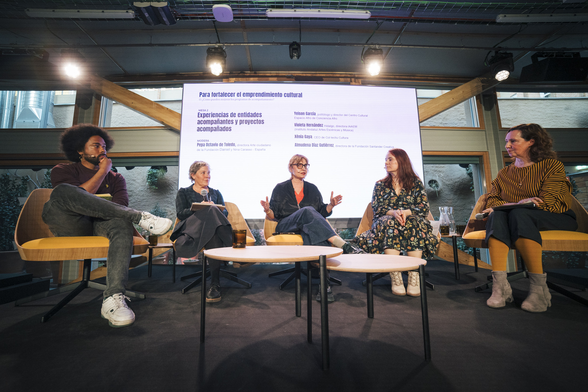 The second round table brought together voices that, from different perspectives, shared their experiences in cultural entrepreneurship: Yeison García, political scientist and director of the Conciencia Afro Cultural Center; Violeta Hernández Hidalgo, director of the Andalusian Institute of Performing Arts and Music (IAAEM); Xenia Gaya, CEO of Col·lectiu Cultura; and Almudena Díaz Gutiérrez, director of the Santander Creativa Foundation.