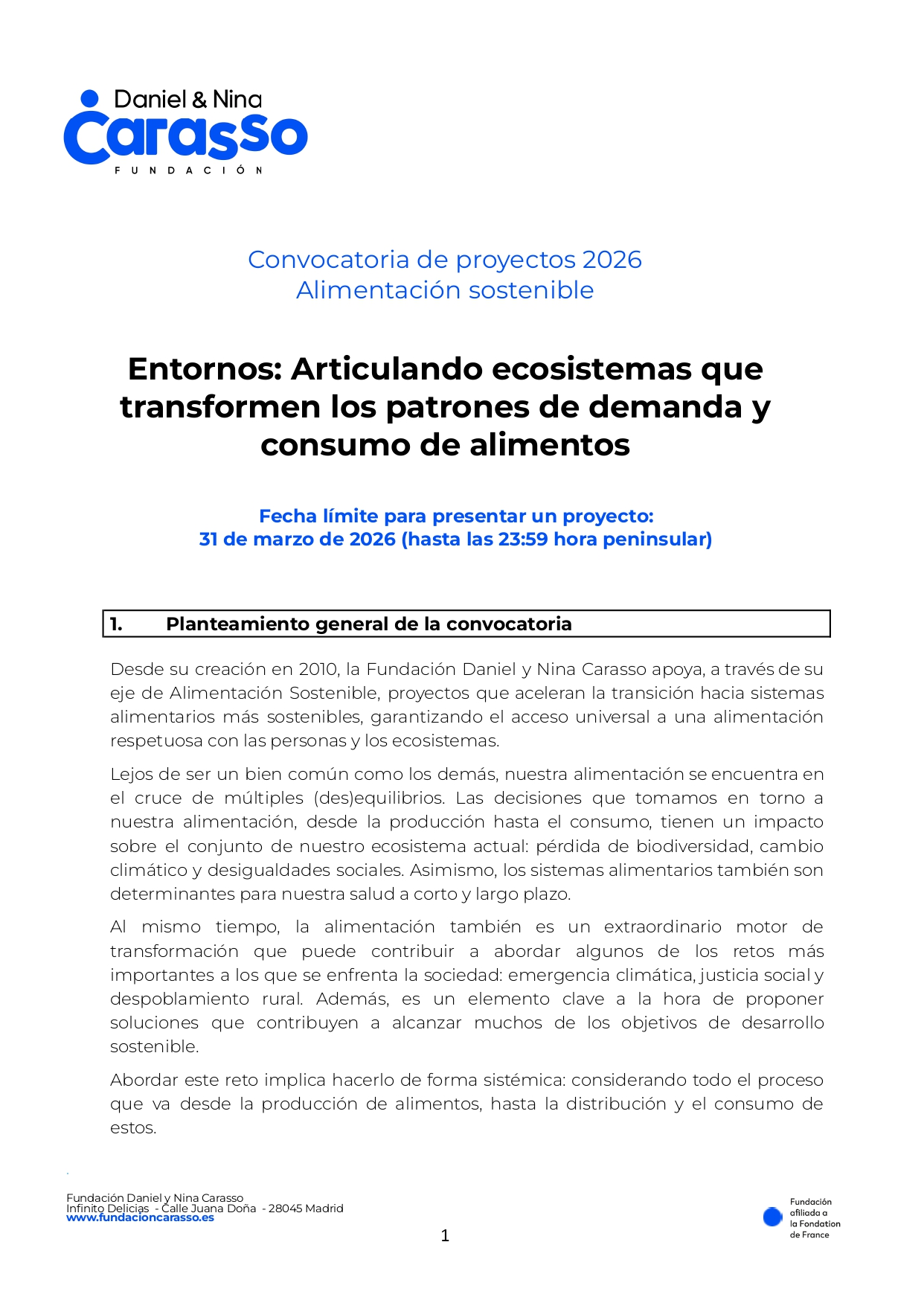 La primera convocatoria Entornos se abre este 2 de marzo y transcurrirá en dos fases. La primera de ellas permanecerá abierta hasta el 31 de marzo de 2026. Está dirigida a proyectos liderados por entidades sin ánimo de lucro comprometidas con la transición hacia sistemas alimentarios sostenibles, que podrán presentarse de forma individual o en alianza. La Fundación destinará 570.000 euros para apoyar entre 6 y 9 iniciativas, que contarán con respaldo financiero durante un máximo de dos años, con posibilidad de extensión. Además, se celebrará un encuentro informativo virtual el 16 de marzo a las 16:30 h para resolver dudas y acompañar a las organizaciones interesadas en el proceso de inscripción.