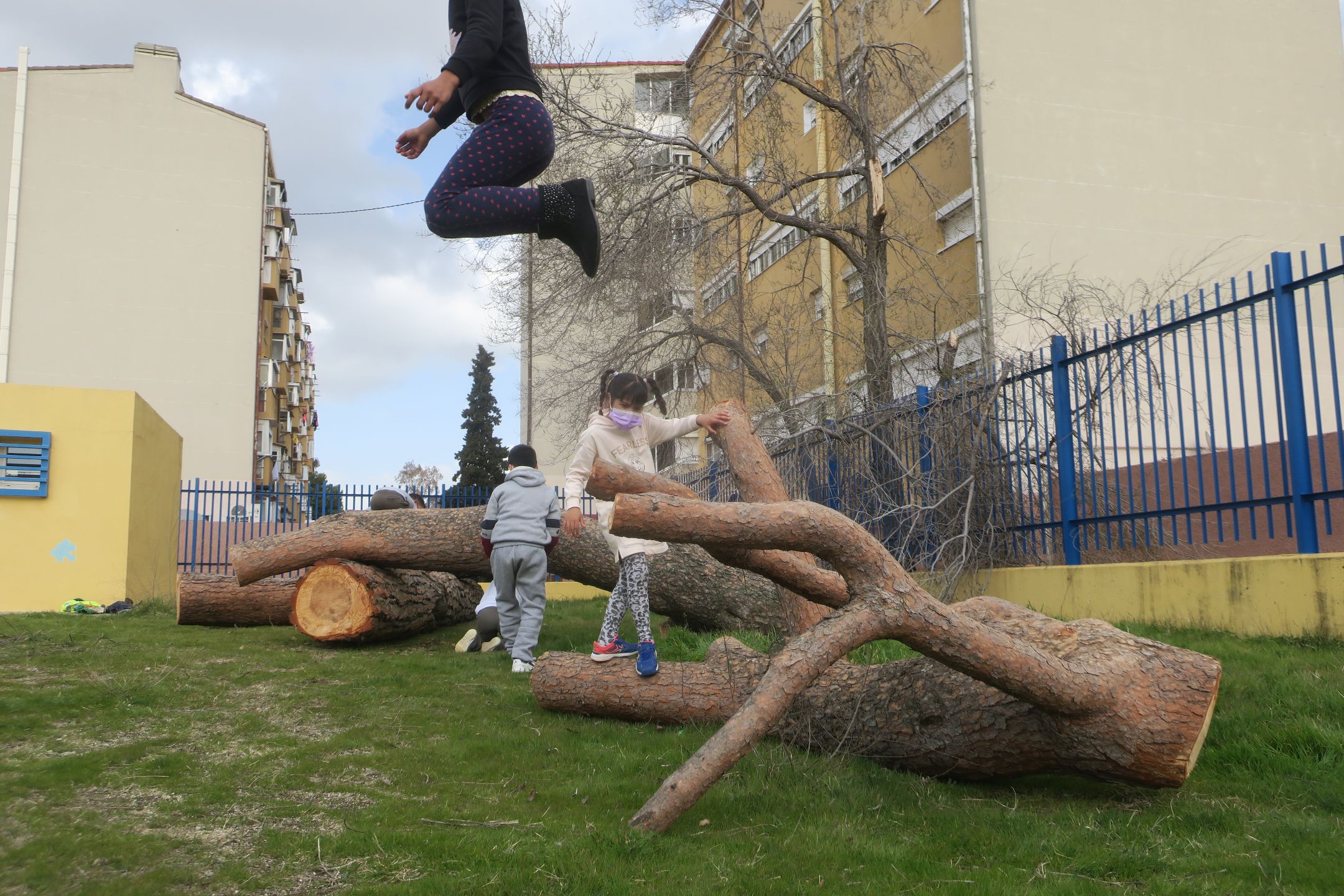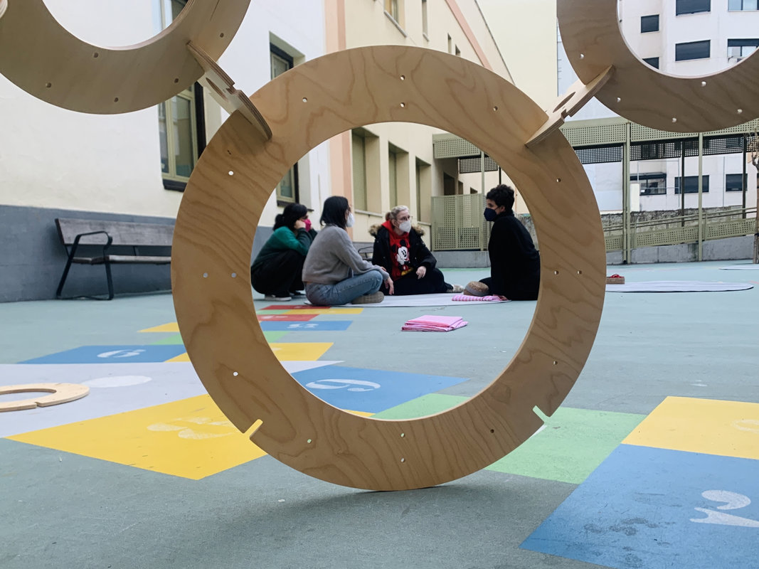 Os proponemos un viaje hasta el  CEIP Huerta de Santa Marina (Andalucía). Si prestamos atención podemos escuchar a un grupo de escolares charlando junto a miembros de la cooperativa de arquitectas Cotidiana. Han partido de la idea de las cinco pieles del artista y arquitecto austríaco Hundertwasser que invita a repensar la forma de estar en el mundo según la cual la primera capa es la epidermis, la segunda la ropa, la tercera la identidad, la cuarta la piel y la quinta la tierra. Niños y niñas se interrogan sobre la ventilación de sus propias aulas y, planteando una transformación del uso del patio, recuperan una solución sencilla y bioclimática: las celosías.