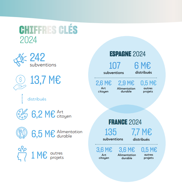 Tout au long de l’année 2024, nous avons accompagné des idées prometteuses et des dynamiques collectives porteuses d’avenir. Nous sommes nombreux à croire qu’il est encore temps. Et qu’au-delà de la tentation de la peur ou du repli, il existe un désir profond de transformation. C’est notre rôle, en tant que Fondation, de l’accompagner, de le nourrir, de le partager, de le rendre visible. C’est ce que nous attachons à faire depuis 15 ans en France et 10 ans en Espagne. Ensemble, continuons à cultiver les possibles !