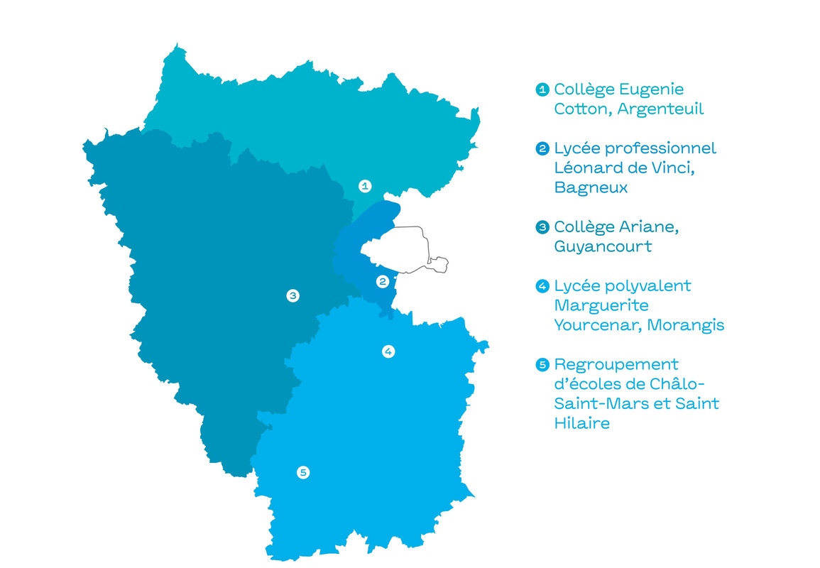 Photos: © Droits Réservés Collège Ariane Guyancourt / Collège Eugénie Cotton Argenteuil / Écoles de Chalo-Saint-Mars et Saint-Hilaire / Lycée polyvalent Marguerite Yourcenar Morangis / Lycée professionnel Léonard de Vinci Bagneux